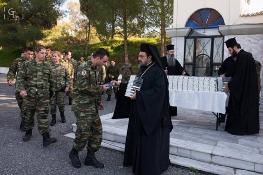 Ο κ. Χρυσόστομος τέλεσε τον αγιασμό και στη συνέχεια μοίρασε στους νεοσύλλεκτους και στα στελέχη της μονάδας την Καινή Διαθήκη, η οποία είναι προσφορά της Ελληνικής Βιβλικής Εταιρείας. Απευθυνόμενος στους οπλίτες, τόνισε ότι επιτελούν ιερό καθήκον υπηρετώντας την πατρίδα. Παράλληλα, τους ευχήθηκε να έχουν υγεία και δύναμη για να περατώσουν τη θητεία τους και να θυμούνται ότι ανά πάσα στιγμή η πατρίδα μπορεί να τους χρειαστεί. Στη συνέχεια, ο μητροπολίτης μετέβη στην αίθουσα επιχειρήσεων της Μονάδας, όπου ο διοικητής αντισυνταγματάρχης Ευάγγελος Ντίλιος τον ευχαρίστησε, ενώπιον όλων των αξιωματικών του στρατοπέδου, για την επίσκεψή του.