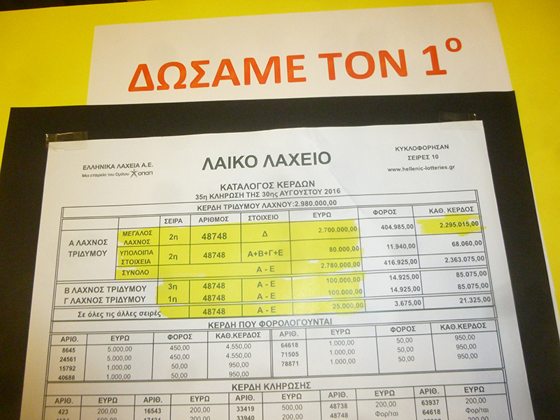 Τα περισσότερα χρήματα, τα 2,7 εκ. ευρώ, πήρε ένας άνδρας που ζει σε χωριό της περιοχής μας. Το τυχερό πρακτορείο ήταν του Κονταργύρη στην οδό 23ης Μαρτίου, το οποίο διέθεσε όλες τις σειρές με το τυχερό νούμερο, το 48748.