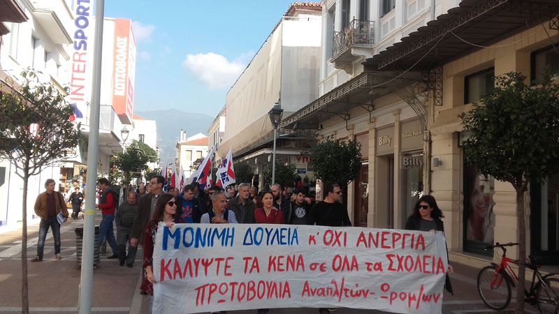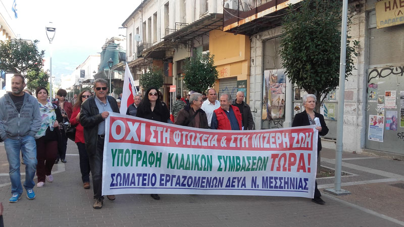 Σύμφωνα με την ίδια ανακοίνωση: "Οι διαδηλωτές συγκεντρώθηκαν στην πλατεία 23ης Μαρτίου. Χαιρετισμό απηύθυναν οι εξής: Κώστας Μιχαλόπουλος, εκ μέρους της συντονιστικής επιτροπής αγώνα των συνταξιούχων του νομού Φώτης Γαϊτάνης, εκ μέρους του ΠΑΜΕ εκπαιδευτικών Δήμητρα Νούτσου, εκ μέρους της πρωτοβουλίας αναπληρωτών και ωρομίσθιων εκπαιδευτικών Παναγιώτης Κουφαλάκος, εκ μέρους του σωματείου εργαζομένων στις ΔΕΥΑ Μεσσηνίας. Ακολούθησε μαχητική διαδήλωση στους δρόμους της πόλης".»