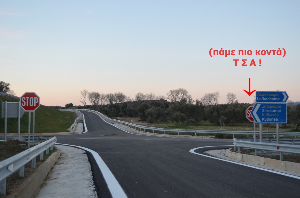 Όπως μαρτυρούν οι φωτογραφίες, ο οδηγός πρέπει να φτάσει σε απόσταση αναπνοής από το stop για να το παρατηρήσει, αφού αυτό κρύβεται εντελώς από τις μεγάλες μπλε πινακίδες με τα βέλη σήμανσης προς Ξηροκάμπι/Κυδωνιά και Λευκόχωμα.