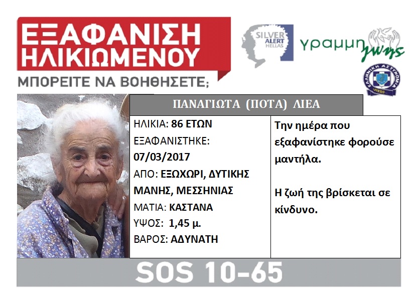 Υπάρχει εξαφάνιση ηλικιωμένης από την περιοχή του Εξωχωρίου Δυτικής Μάνης, Μεσσηνίας. Εάν γνωρίζετε κάτι επικοινωνήστε με τη ΓΡΑΜΜΗ ΖΩΗΣ, όλο το 24ωρο, στην Εθνική Γραμμή SOS 1065.