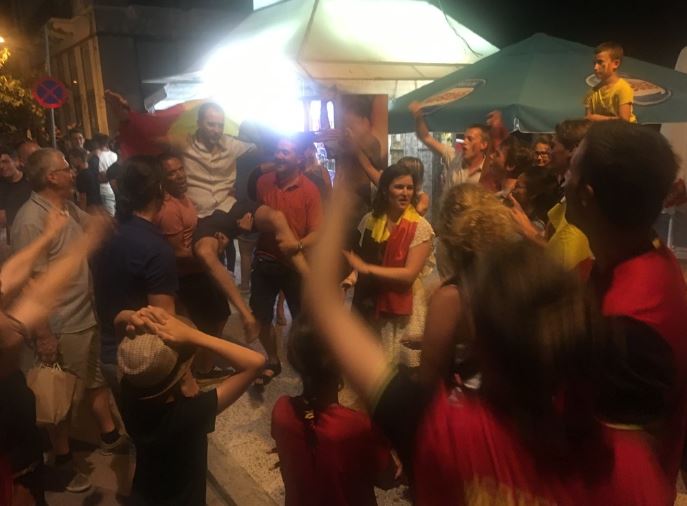 Με το σφύριγμα της λήξης του δεύτερου προημιτελικού, που βρήκε την ομάδα τους να επικρατεί με 2-1 και να αποκλείει τη Βραζιλία, έστησαν πανηγυρικό σκηνικό στην οδό Ναυαρίνου στο ύψος του "Πανελληνίου" τραβώντας φυσικά τα βλέμματα εκατοντάδων ατόμων, που διασκέδαζαν και έκαναν την βόλτα τους στη παραλιακή ζώνη.