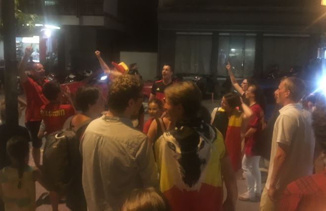 Πρόκειται προφανώς για τουρίστες, που αυτές τις ημέρες βρίσκονται στην Καλαμάτα και όπως φάνηκε δεν έχασαν την ευκαιρία να χαρούν με την ψυχή τους την πρόκριση του Βελγίου στα ημιτελικά του Μουντιάλ.