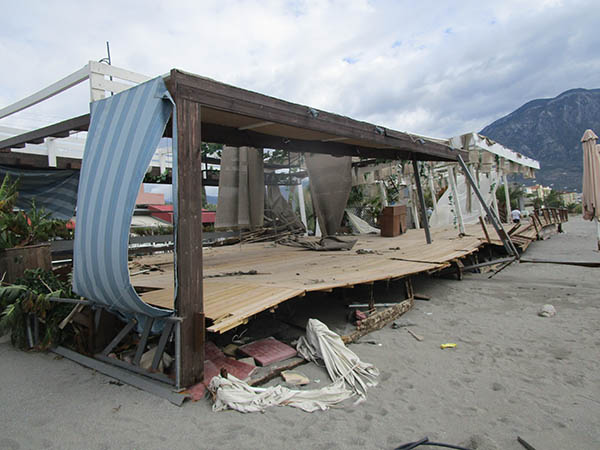 Στην Καλαμάτα, στην παραλιακή ζώνη ο κυκλώνας τσάκισε ό,τι δεν είχε μαζευτεί από ομπρέλες και άλλο εξοπλισμό από τους καταστηματάρχες και βύθισε βάρκες μέσα στο λιμάνι.