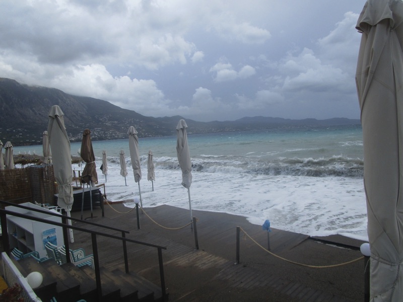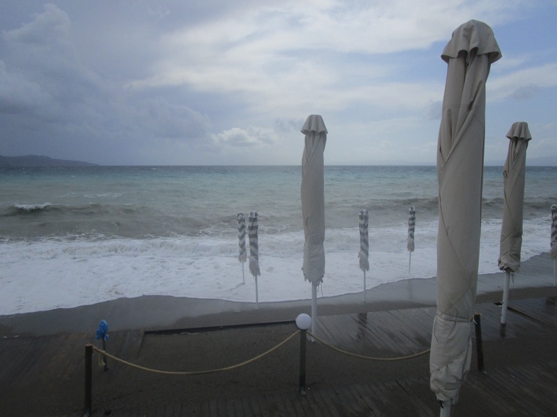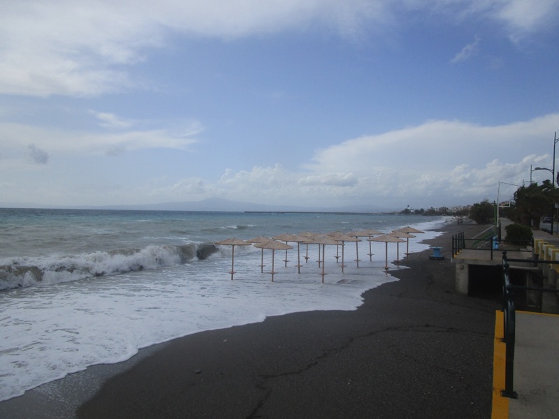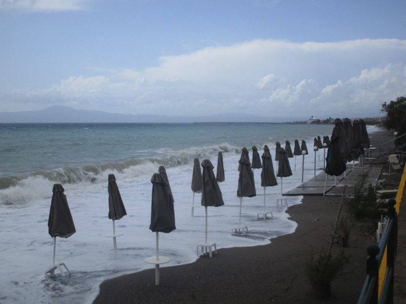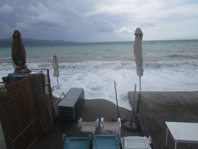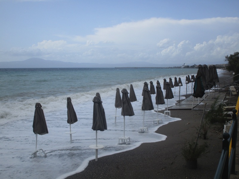 Πέρα από τη ζέστη, το τοπίο ήταν χειμωνιάτικο, καθώς τα μεγάλα κύματα κάλυπταν όλη την ακτή, φθάνοντας μέχρι τον τοίχο του μεγάλου νοτίου πεζοδρομίου της Ναυαρίνου, περνώντας μέσα από τις ομπρέλες που έχουν παραμείνει σε παραλιακά καταστήματα για τους κολυμβητές του φθινοπώρου. Κι εξαιτίας των κυμάτων η θάλασσα δεν ήταν καθαρή.