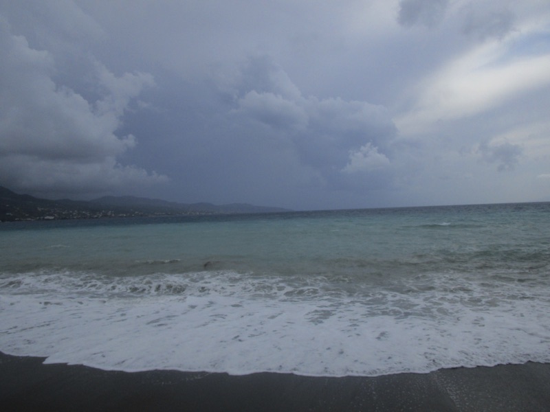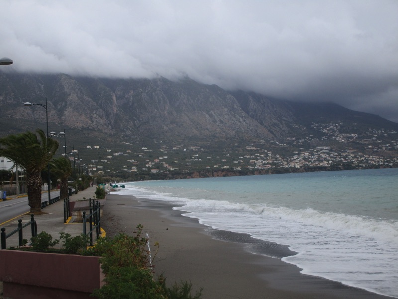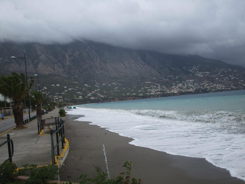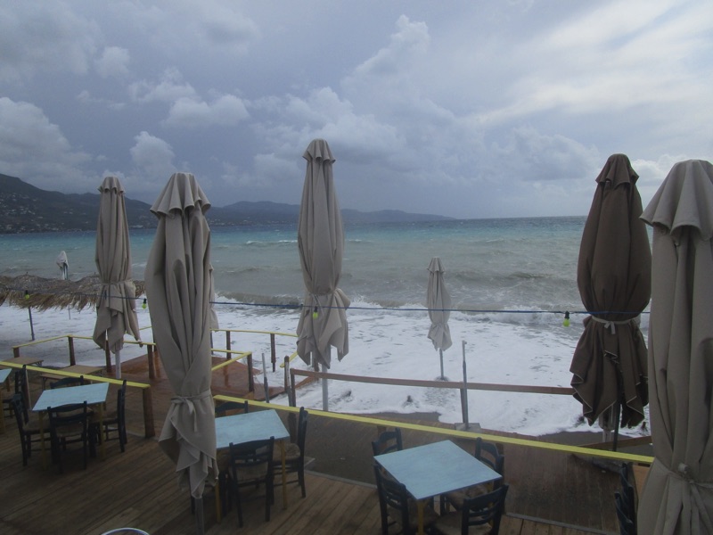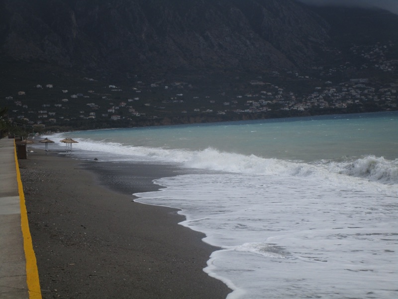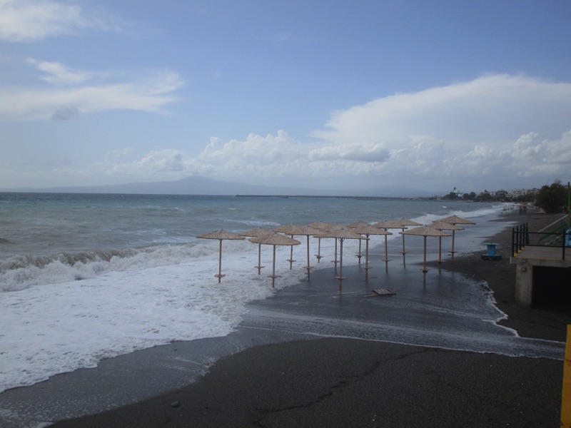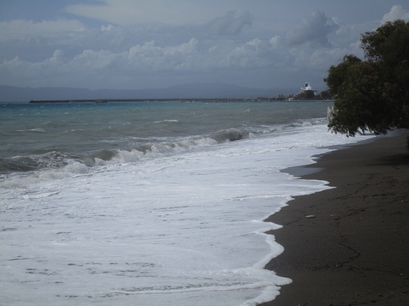 Πέρα από τη ζέστη, το τοπίο ήταν χειμωνιάτικο, καθώς τα μεγάλα κύματα κάλυπταν όλη την ακτή, φθάνοντας μέχρι τον τοίχο του μεγάλου νοτίου πεζοδρομίου της Ναυαρίνου, περνώντας μέσα από τις ομπρέλες που έχουν παραμείνει σε παραλιακά καταστήματα για τους κολυμβητές του φθινοπώρου. Κι εξαιτίας των κυμάτων η θάλασσα δεν ήταν καθαρή.