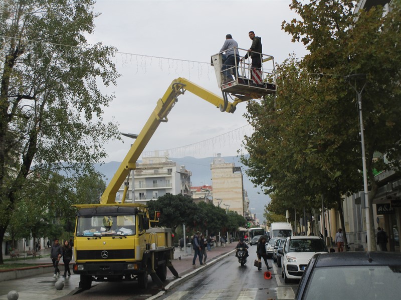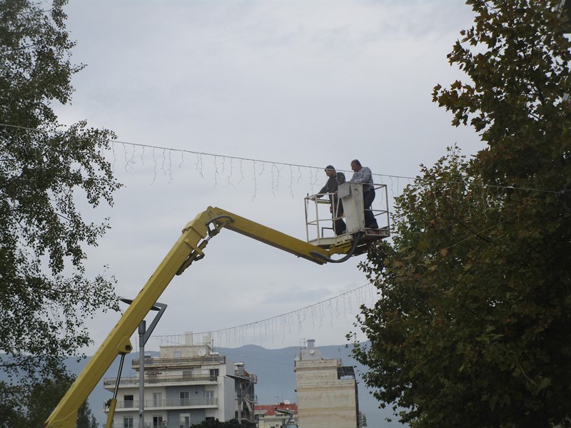 Συνεργείο με γερανοφόρο όχημα τοποθετούσε φωτάκια στην Αριστομένους και στην πλατεία και ένα ακόμα έβαζε φωτάκια και κορδέλες σε δέντρα της πλατείας.