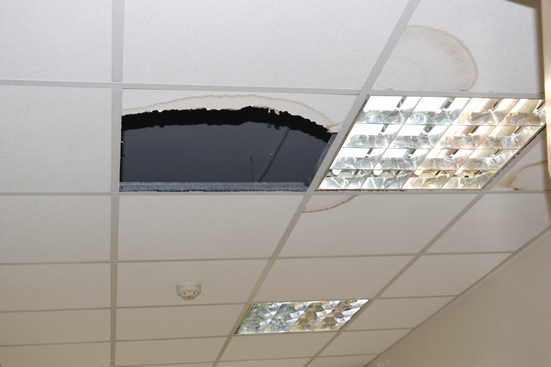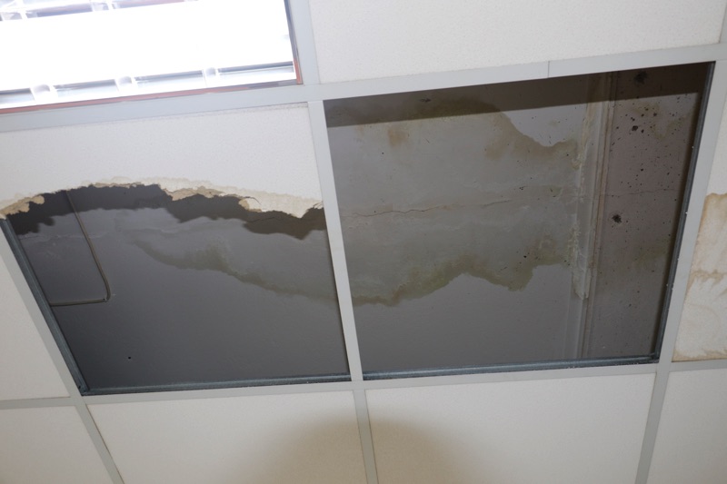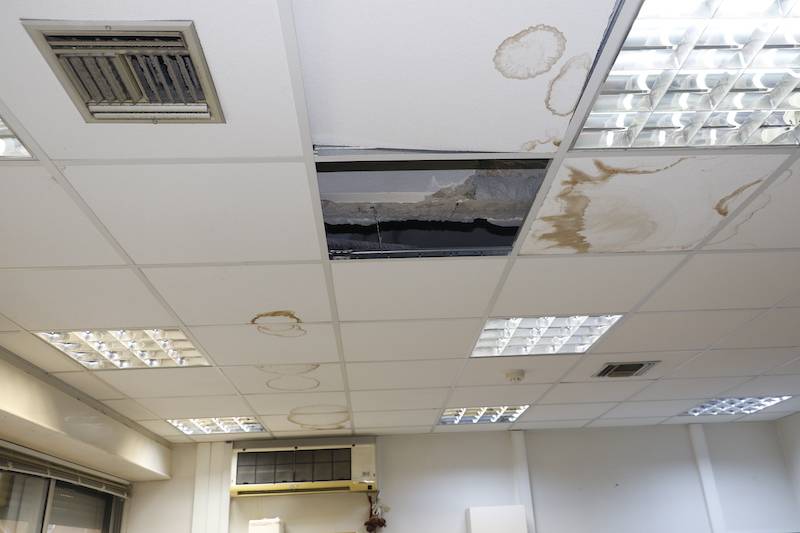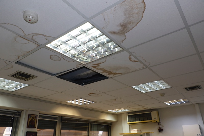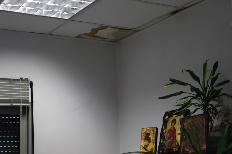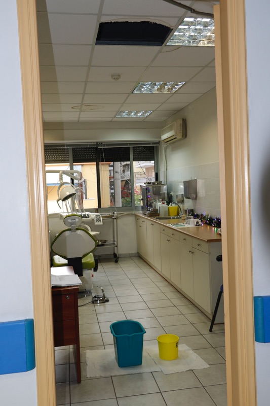 Πριν λίγες μέρες μάλιστα ένα κομμάτι ψευδοροφής κατέρρευσε στο γραφείο του γυναικολόγου Δημήτρη Τζαμουράνη αποκαλύπτοντας μια ρωγμή, που όταν βρέχει έντονα περνάει νερό σαν... να βρέχει και μέσα. Η οδοντίατρος Χριστίνα Μούστου αναγκάζεται τις βροχερές μέρες και υποδέχεται τους ασφαλισμένους με δύο κουβάδες στην πόρτα, ενώ μετά από ένα Σαββατοκύριακο με βροχή βρήκε το πάτωμα στο οδοντιατρείο γεμάτο νερά.