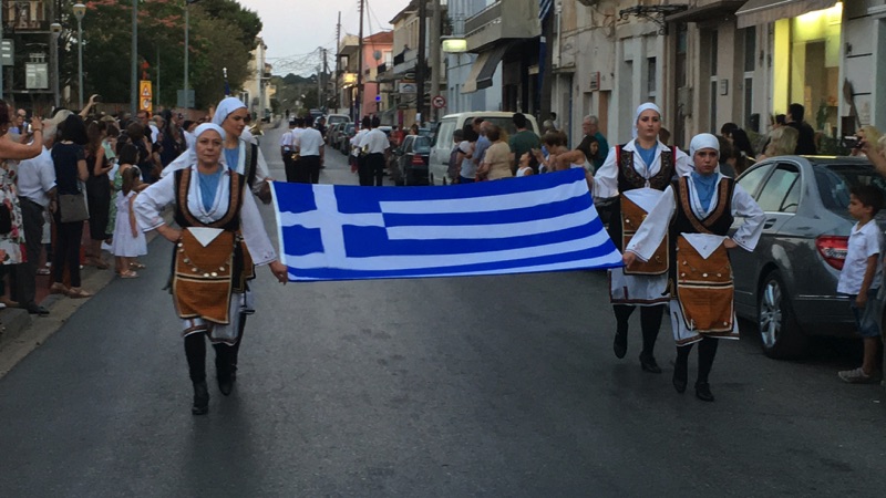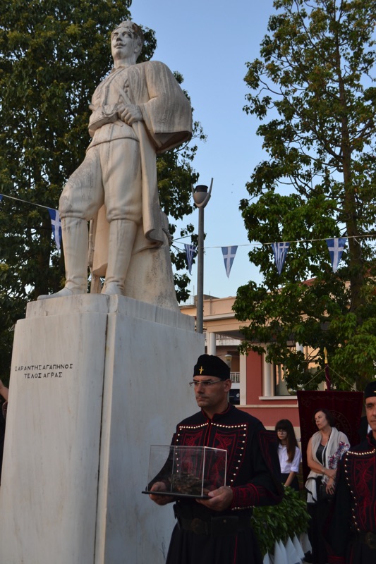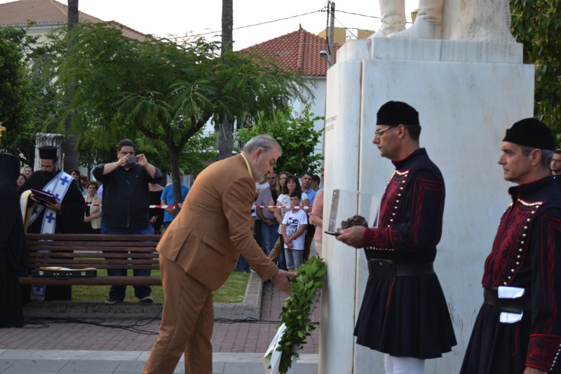 Στη συνέχεια έγινε ανάκρουση του εθνικού ύμνου από τη Δημοτική Φιλαρμονική Γαργαλιάνων και τήρηση ενός λεπτού σιγής, καθώς και παρέλαση της Φιλαρμονικής, χορευτικών τμημάτων των δύο συλλόγων και αντιπροσωπείας μαθητών με κατάληξη την κεντρική πλατεία. Εκεί ο δήμαρχος Τριφυλίας Γιώργος Λεβεντάκης ευχαρίστησε όλους για την παρουσία τους και ιδιαίτερα το δήμαρχο Εδεσσας τόσο για την παρουσία του όσο και για τη φιλοξενία του πριν λίγες ημέρες στην Εδεσσα. Από εκεί και πέρα τόνισε ότι οι Μακεδόνες ξέρουν να τιμούν τους αγωνιστές, ενώ υποσχέθηκε πως του χρόνου θα υπάρξει ένας χώρος, ένα μουσείο που θα τιμά αυτό τον λεβέντη πατριώτη μας που θυσιάστηκε για την πατρίδα του.