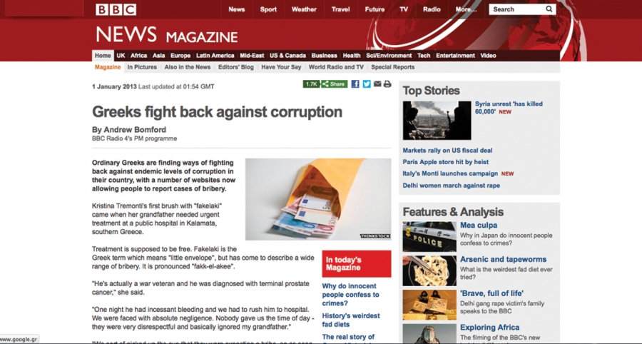 Οι Ελληνες στην αντεπίθεση κατά της διαφθοράς. Οι απλοί Ελληνες βρίσκουν τρόπους για να καταπολεμήσουν τα ενδημικά επίπεδα διαφθοράς στη χώρα τους, με έναν αριθμό από ιστοσελίδες, που τώρα επιτρέπουν στους ανθρώπους να αναφέρουν περιπτώσεις δωροδοκίας. Η πρώτη επαφή της Χριστίνας Τρεμόντι με το "φακελάκι" ήρθε όταν ο παππούς της χρειάστηκε επείγουσα θεραπεία σε δημόσιο νοσοκομείο στην Καλαμάτα, στη Νότια Ελλάδα. Η θεραπεία υποτίθεται ότι ήταν δωρεάν. Fakelaki είναι η ελληνική λέξη που σημαίνει «φακελάκι», αλλά έχει έρθει για να περιγράψει ένα ευρύ φάσμα δωροδοκίας. (Οπως χαρακτηριστικά γράφει η Βρετανή ρεπόρτερ «it is pronounced "fakk-el-akee"»). "Είναι βετεράνος του πολέμου και είχε διαγνωστεί με καρκίνο του προστάτη, σε τελευταίο στάδιο", μας είπε: "Eνα βράδυ είχε αδιάκοπη αιμορραγία και έπρεπε να βιαστούμε να τον πάμε στο νοσοκομείο και εκεί βρεθήκαμε αντιμέτωποι με απόλυτη αμέλεια. Κανείς δεν μας έδινε σημασία. Hταν πολύ ασεβείς και ουσιαστικά αγνοούσαν τον παππού μου". "Κάποια στιγμή πήραμε γραμμή ότι περίμεναν ένα δωράκι και έτσι, μέχρι να ανοίξει η μητέρα μου την τσάντα της και να τους δώσει ένα ποσό γύρω στα 300 ευρώ, ο παππούς υποβλήθηκε σε χειρουργείο εντός μιας ώρας". Η εμπειρία αυτή, την τραυμάτισε σε τέτοιο βαθμό ώστε ακόμη και όταν σπούδαζε στο πανεπιστήμιο στις ΗΠΑ, ήταν αποφασισμένη να ανακαλύψει το πόσο διαδεδομένη ήταν αυτή η πρακτική στην Ελλάδα. Εμπνευσμένη από παρόμοιες ιστοσελίδες στην Ινδία και την Κένυα, η Χριστίνα έφτιαξε το edosafakelaki (που σημαίνει "έκανα μια δωροδοκία"), η οποία επιτρέπει στους ανθρώπους να αναφέρουν ανώνυμα περιπτώσεις δωροδοκίας ή ακόμη και περιπτώσεις όπου δωροδοκίες απορρίφθηκαν. "Στην αρχή, οι άνθρωποι ήταν έκπληκτοι βλέποντας ιστορίες που είχαν ακούσει στο παρελθόν μόνο σε τραπέζι ή με φίλους" λέει: "Αλλά τώρα πραγματικά πιστεύω ότι υπάρχει μια πανελλήνια στάση ευθύνης των πολιτών, η οποία αυξάνεται". Σε λίγο περισσότερο από ένα μήνα, 1.000 διαφορετικές περιπτώσεις δωροδοκίας εμφανίστηκαν στην ιστοσελίδα, ωθούμενες και από συνομιλίες που έγιναν σε ιστοσελίδες κοινωνικής δικτύωσης: "Οι άνθρωποι είναι απογοητευμένοι, είναι θυμωμένοι, αισθάνονται εξαπατημένοι, αισθάνονται κακοποιημένοι. Αισθάνονται ότι έχουν απειληθεί από ένα σύστημα που τους έχει καταστήσει ανίσχυρους μπροστά του". Ο θυμός έχει υποκινηθεί και από τη σοβαρότητα της οικονομικής κρίσης και τις επιπτώσεις που έχει στις ζωές των ανθρώπων. Πάνω από το ένα τέταρτο των Ελλήνων είναι άνεργοι. Πολλοί δεν μπορούν πλέον να αντέξουν οικονομικά τις σχετικά μικρής κλίμακας δωροδοκίες, που είχαν προηγουμένως αποδεχτεί ως τρόπο ζωής. Οι ιστορίες τρόμου αφθονούν στην ιστοσελίδα -το 60% των αναρτήσεων αφορά τη διαφθορά στο δημόσιο σύστημα υγείας, το 15% τις δωροδοκίες για την απόκτηση άδειας οδήγησης και το 4% την έκδοση των οικοδομικών αδειών. Οι συμμετοχές είναι επίσης κατανεμημένες ανά περιοχή στην Ελλάδα και συχνά κατονομάζονται μεμονωμένα ιδρύματα και έτσι υπάρχουν πολλές ενδείξεις για τις Αρχές να το παρακολουθήσουν, εφόσον αυτές το επιθυμούν. Ενα άτομο έγραψε: "Ο πατέρας μου είχε καρκίνο και έπρεπε να κάνει εγχείρηση στο πάγκρεάς του. Ο χειρουργός ζήτησε εμμέσως τα χρήματα και πριν από την επέμβαση έβαλα 500 ευρώ πάνω στο γραφείο του. Από την έκφραση του μπορούσα να καταλάβω ότι δεν ήταν αρκετά. Η μητέρα μου επέμενε να του δώσουμε περισσότερα. Α, υπήρχε κ