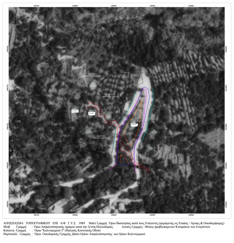 Αργότερα, όταν έγιναν αντιληπτές οι επιδιώξεις τους για κατάληψη του υπόλοιπου διαθέσιμου πλάτους του δρόμου και ενσωμάτωσης του σε μικρά παρόδια αγροτεμάχια που αγόρασαν, ισχυρίστηκαν ότι δήθεν “από λάθος έγραψαν 5,50 μ. ελάχιστο πλάτος, αντί του δήθεν ορθού 3,50 μ.” σε πλήθος Τοπογραφικών Σχεδίων τους και Συμβολαίων αγοράς αγροτεμαχίων(βλ. Αίτηση – Δήλωση ενάγοντος σε ΥΔΟΜ Αρ. Πρ. 3704/2.7.2014). Τα σχέδια και τα συμβόλαια υπογράφονταν από τους ίδιους τους Ενάγοντες, ως Μελετητές Μηχανικούς και ως Συνιδιοκτήτες !