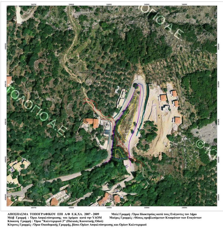 Γ. Οφείλετε να λάβετε σοβαρά υπόψιν σας επείγοντα θέματα ασφάλειας των κατοίκων περιοχής, οι οποίοι πρόκειται να υποστούν βλάβες και ζημίες σε περίπτωση αφαίρεσης τμημάτων του υφιστάμενου δρόμου, δεδομένου ότι παρακωλύεται η συγκοινωνία και η απρόσκοπτη προσπέλαση προς και από τον οικισμό. Λάβετε επίσης υπόψιν σας ότι η περιοχή βιώνει κατά διαστήματα έντονα φαινόμενα κατολισθήσεων και πλημμυρών, τόσο λόγω των απόκρημνων γκρεμών της “Ροβόλας”, όσο και λόγω πρόσθετης επικινδυνότητας από τους χιλιάδες τόννους μπάζα και αδρανή υλικά που ρίχτηκαν αυθαίρετα σε τμήματα του “Καλντεριμιού 3”. Εξυπακούεται ότι οι καταιγίδες – υδροστόβιλοι λόγω της κλιματικής κρίσης και η πρόσφατη σεισμική δραστηριότητα στην ευρύτερη περιοχή εντείνουν την επικινδυνότητα".