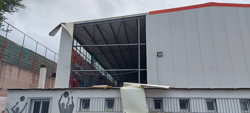 Οι ισχυρές ριπές ανέμου ξήλωσαν τα πάνελ από ένα μεγάλο τμήμα της συγκεκριμένης πλευράς ανοίγοντας μια μεγάλη τρύπα.
