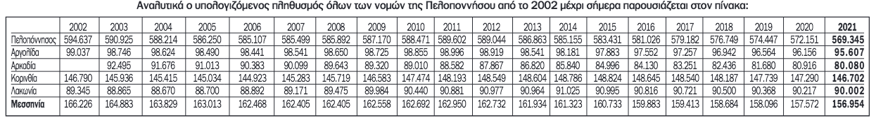 Αναλυτικά ο υπολογιζόμενος πληθυσμός όλων των νομών της Πελοποννήσου από το 2002 μέχρι σήμερα παρουσιάζεται στον πίνακα: