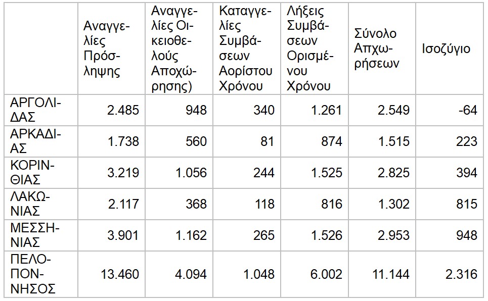 Θετικό ήταν το Ισοζύγιο κατά 2316 θέσεις και στην Περιφέρεια Πελοποννήσου.