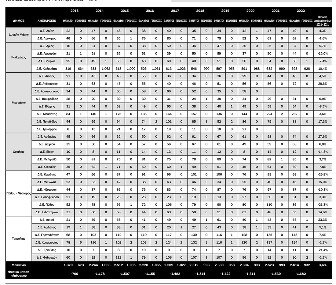 Αναλυτικά τα στοιχεία των ληξιαρχείων για τις γεννήσεις και τους θανάτους στη Μεσσηνία από το 2013 μέχρι το 2022 παρουσιάζονται στον πίνακα: