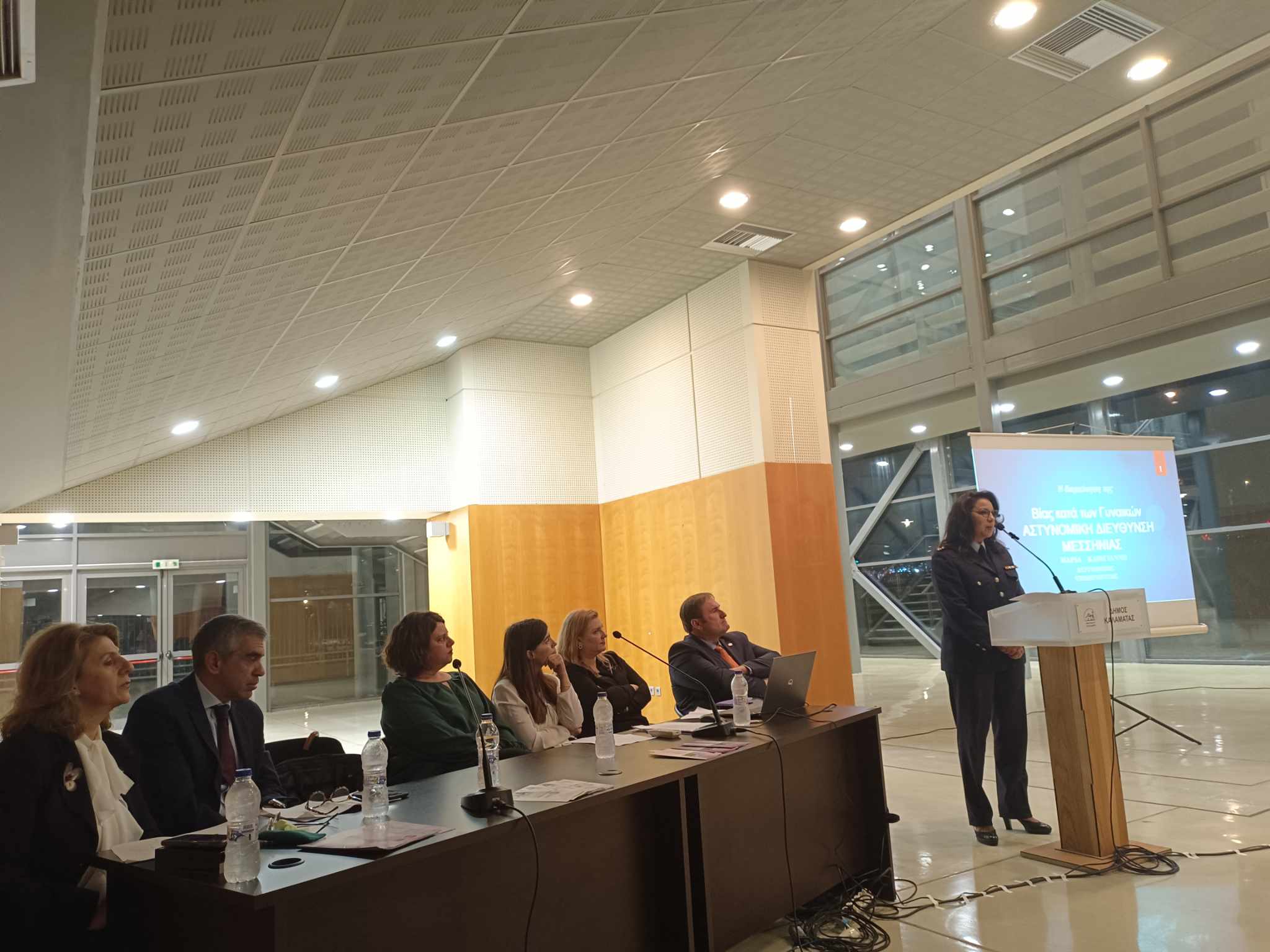 Στη συνέχεια, το λόγο πήρε η Αστυνομική Υποδιευθύντρια και διαπιστευμένη αξιωματικός της ΕΛ.ΑΣ. σε θέματα ενδοοικογενειακής βίας Μαρία Καραγιάννη, η οποία μοιράστηκε στοιχεία που έρχονται από την Ευρωπαϊκή Επιτροπή, τονίζοντας πως μια στις τρεις γυναίκες στην Ε.Ε. έχει υποστεί σωματική – σεξουαλική βία από την ηλικία των 15 ετών, μια στις είκοσι γυναίκες έχει υπάρξει θύμα βιασμού, πάνω από το 55% των γυναικών έχει υποστεί σεξουαλική παρενόχληση, ενώ μια στις τρεις γυναίκες έχει βιώσει σωματική ή σεξουαλική βία από ένα ενήλικο στην παιδική της ηλικία, νούμερα που τα χαρακτήρισε τρομακτικά, προερχόμενα όπως είπε από τον εργασιακό χώρο μέχρι τον κοντινό κύκλο. Βάση της εμπειρίας της, σημείωσε πως για να καταγγείλει μια γυναίκα που είναι θύμα βίας τον σύντροφό της, συνήθως έχουν προηγηθεί τουλάχιστον 35 επεισόδια βίας, έχοντας ουσιαστικά εθιστεί. Παράλληλα, δήλωσε πως το 2022 πανελλαδικά ήταν το έτος με τη μεγαλύτερη έξαρση πάνω στο ζήτημα αυτό, το οποίο συνδυάστηκε με τις περισσότερες δολοφονίες. «Δικαίωμα δεν έχει μόνο το θύμα να καταγγείλει τη βία που του ασκείται, αλλά κάθε ένας από εμάς που γίνεται κοινωνός και θα αντιληφθεί οποιαδήποτε πράξη βίας» πρόσθεσε, δίνοντας στη συνέχεια πληροφορίες για τη σειρά που ακολουθείται από την ΕΛ.ΑΣ. όταν πρέπει να παρέμβει. Επιπλέον, γνωστοποίησε πως λειτουργεί πιλοτικά μια εφαρμογή σε Αθήνα και Θεσσαλονίκη με το όνομα “Panic Button”, μέσω της οποίας όταν μια γυναίκα βρεθεί σε κατάσταση έκτακτης ανάγκης, μέσω του κινητού τους ειδοποιεί τις Αρχές με το πάτημα ενός κουμπιού και δίνει το στίγμα πού βρίσκεται εκείνη τη στιγμή.
