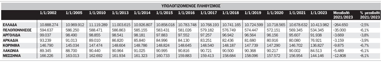 Συγκεκριμένα και σύμφωνα με χθεσινά στοιχεία της Ελληνικής Στατικής Αρχής ο υπολογιζόμενος πληθυσμός (γεννήσεις μείον θάνατοι συν μεταναστευτικές ροές) της Μεσσηνίας μειώθηκε από 156.954 κατοίκους την 1η Ιανουαρίου 2021, σε 144.146 κατοίκους την 1η Ιανουαρίου 2023. Η ποσοστιαία μείωση 8,1% που καταγράφηκε στη Μεσσηνία είναι η μεγαλύτερη από την μέση μείωση 6,1% που καταγράφηκε στην Περιφέρεια Πελοποννήσου και τη μέση πανελλαδική μείωση 2,5%. Συνολικά ο υπολογιζόμενος πληθυσμός της Περιφέρειας Πελοποννήσου μειώθηκε κατά 35.000 κατοίκους. Στην Κορινθία τη διετία 2021 και 2022 ο υπολογιζόμενος πληθυσμός μειώθηκε κατά 9.875 κατοίκους (μείωση 6,7%), στη Λακωνία κατά 5.489 κατοίκους (μείωση 6,1%), στην Αρκαδία κατά 3.159 κατοίκους (μείωση 3,9%) και στην Αργολίδα κατά 3.669 κατοίκους (μείωση 3,8%)
