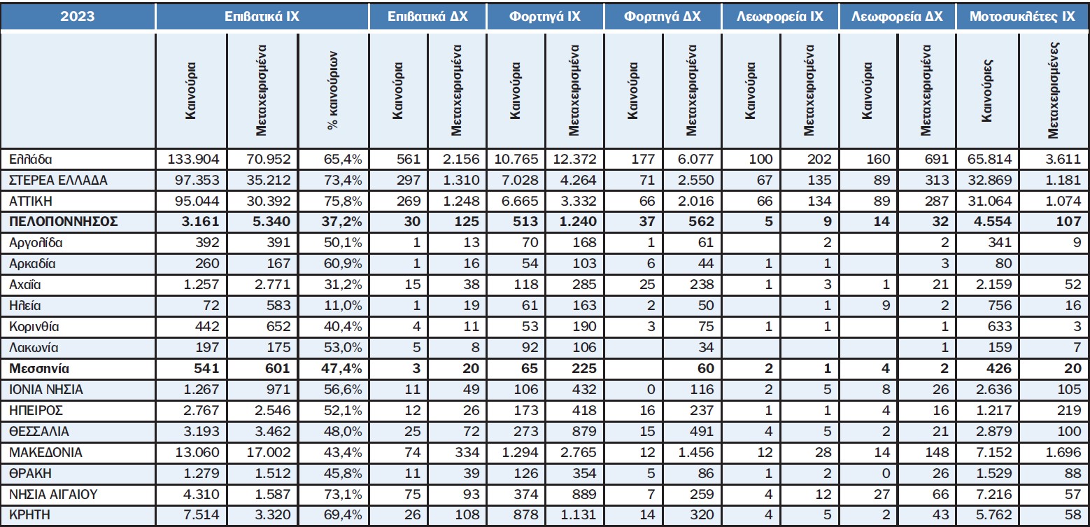 Σε αντίθεση με τα αυτοκίνητα οι Μεσσήνιοι και οι Πελοποννήσιοι όπως και οι υπόλοιποι Έλληνες το 2023 αγόρασαν περισσότερες καινούργιες μοτοσυκλέτες από μεταχειρισμένες. Αξίζει να σημειωθεί ότι σύμφωνα με τα στοιχεία της Ελληνικής Στατιστικής Αρχής για τις εγγραφές οχημάτων, η γεωγραφική ενότητα της Πελοποννήσου έχει το μικρότερο ποσοστό πώλησης καινούργιων αυτοκινήτων (37,2%) επί των συνολικών πωλήσεων από όλες τις υπόλοιπες στατιστικές Περιφέρειες ενώ το μέσο πανελλαδικό ποσοστό είναι 65,4%. Ουσιαστικά 2 στους 3 Έλληνες αγοράζουν καινούργιο αυτοκίνητο ενώ στην Πελοπόννησο 2 στους 3 αγοράζουν μεταχειρισμένο αυτοκίνητο. Το μεγαλύτερο ποσοστό πώλησης καινούργιων αυτοκινήτων καταγράφηκε στη Στερεά Ελλάδα (73,4%, στο οποίο συμπεριλαμβάνεται και η Αττική με ποσοστό 45,8%) και ακολουθούν τα Νησιά Αιγαίου (73,1%) και η Κρήτη