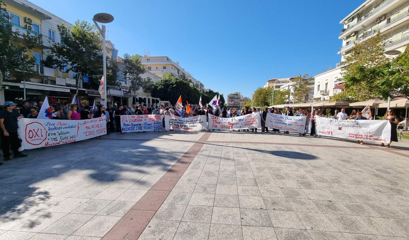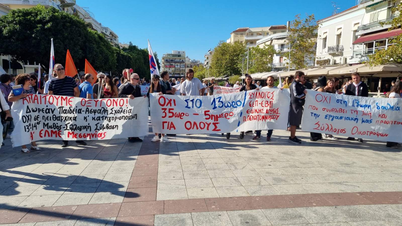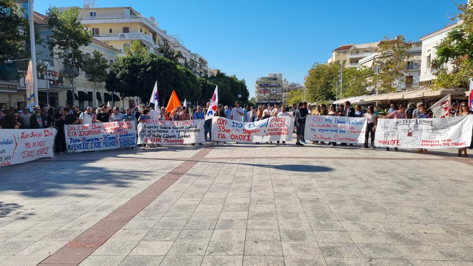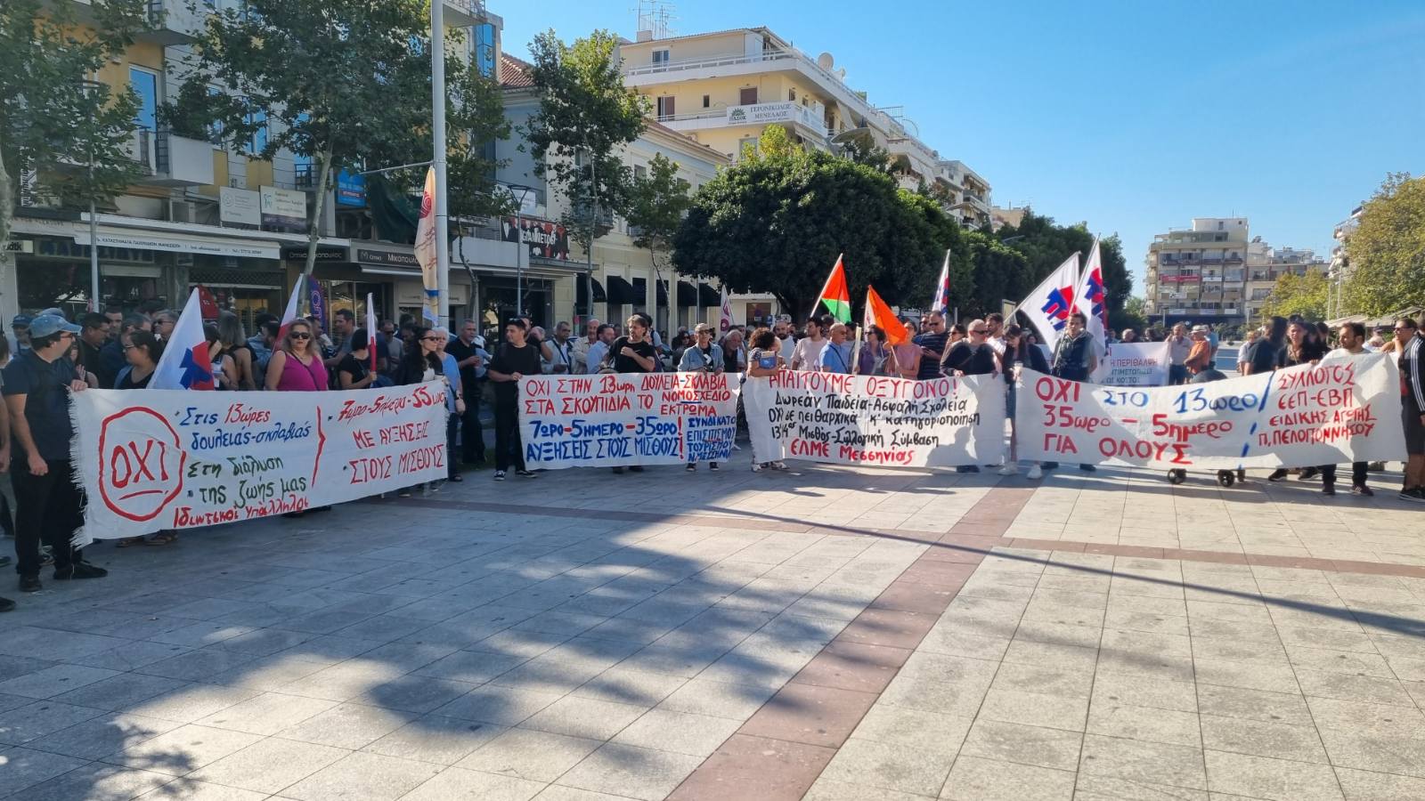 Ζήτησαν “να αποσυρθεί το νέο αντεργατικό τερατούργημα, 7ωρο – 5ήμερο – 35ωρο, με αυξήσεις στους μισθούς. Συλλογικές συμβάσεις εργασίας, επαναφορά του 13ου και 14ου μισθού, 13ης και 14ης σύνταξης, να σταματήσει η γενοκτονία στη Γάζα” και είπαν “όχι στο νέο πειθαρχικό δίκαιο για τους δημοσίους υπαλλήλους”.
