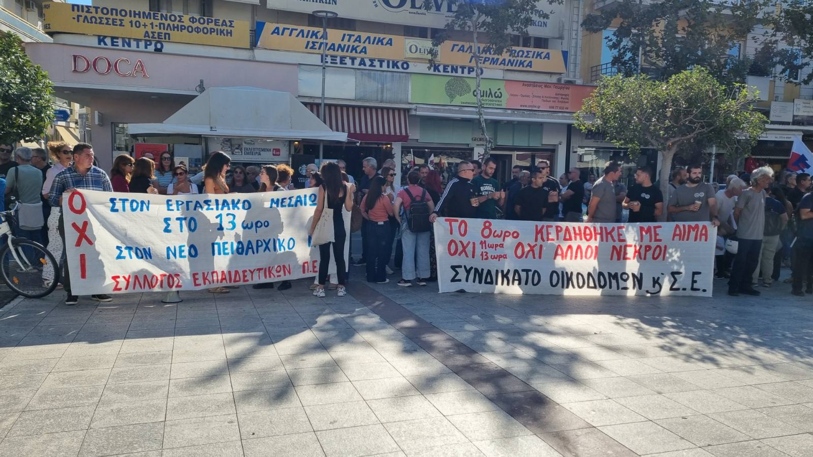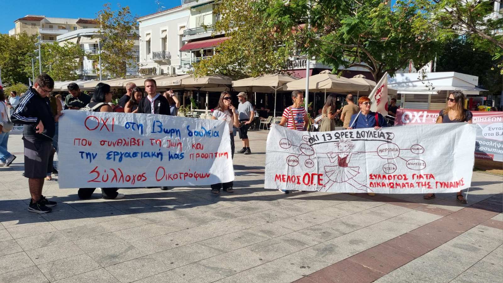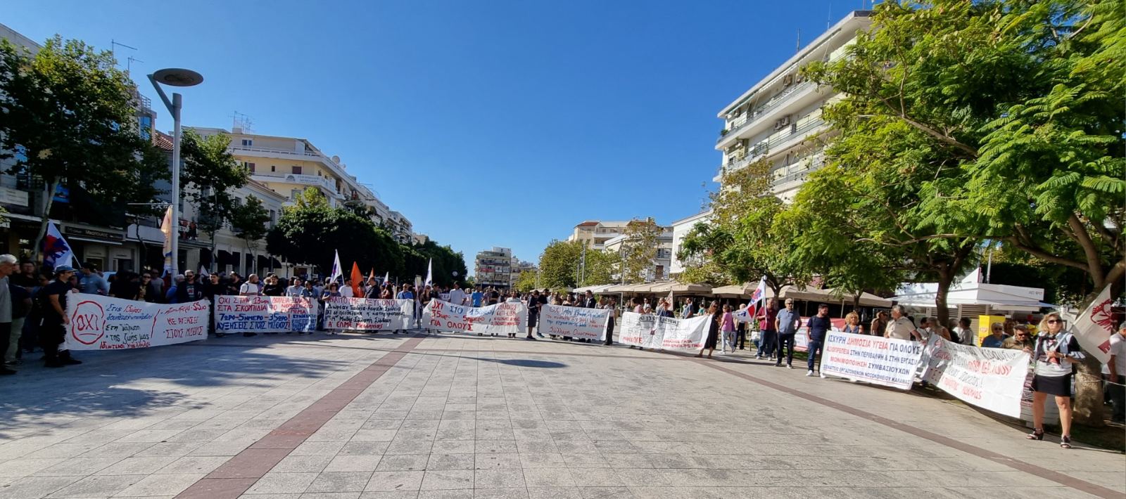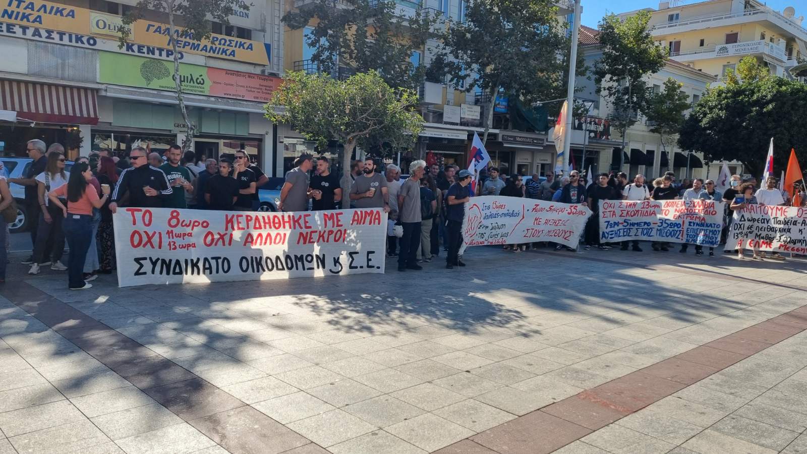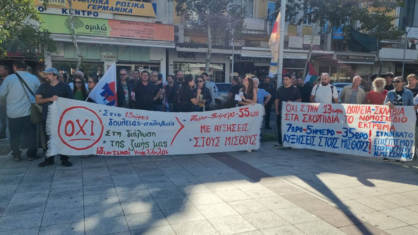 Ζήτησαν “να αποσυρθεί το νέο αντεργατικό τερατούργημα, 7ωρο – 5ήμερο – 35ωρο, με αυξήσεις στους μισθούς. Συλλογικές συμβάσεις εργασίας, επαναφορά του 13ου και 14ου μισθού, 13ης και 14ης σύνταξης, να σταματήσει η γενοκτονία στη Γάζα” και είπαν “όχι στο νέο πειθαρχικό δίκαιο για τους δημοσίους υπαλλήλους”.
