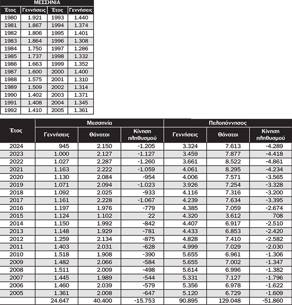 Στη Μεσσηνία ο αριθμός των γεννήσεων το 2024 ήταν μικρότερος από 1.000 ενώ στην Περιφέρεια Πελοποννήσου για δεύτερη συνεχόμενη χρονιά οι γεννήσεις ήταν λιγότερες από 3.500. Εξαιτίας των λίγων γεννήσεων και των πολλών θανάτων, την τελευταία εικοσαετία, ο φυσικός πληθυσμός στη Μεσσηνία έχει μειωθεί 15.753 κατοίκους και στην Περιφέρεια Πελοποννήσου κατά 51.860 κατοίκους. Στη Μεσσηνία και στην Περιφέρεια οι γεννήσεις μειώνονται με αυξανόμενο ρυθμό τόσο εξαιτίας της γήρανσης του πληθυσμού όσο και εξαιτίας της μετανάστευσης των γόνιμων ηλικιών για πλουσιότερες Περιφέρειες. Αξίζει να σημειωθεί  ότι το 1980 είχαν καταγραφεί στη Μεσσηνία 1.921 γεννήσεις και πέρσι μόλις 945 γεννήσεις