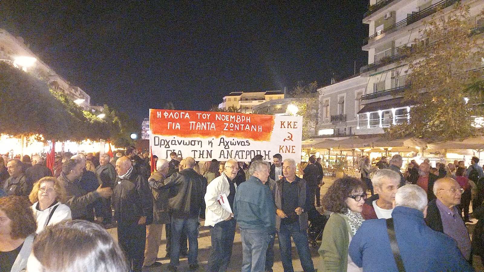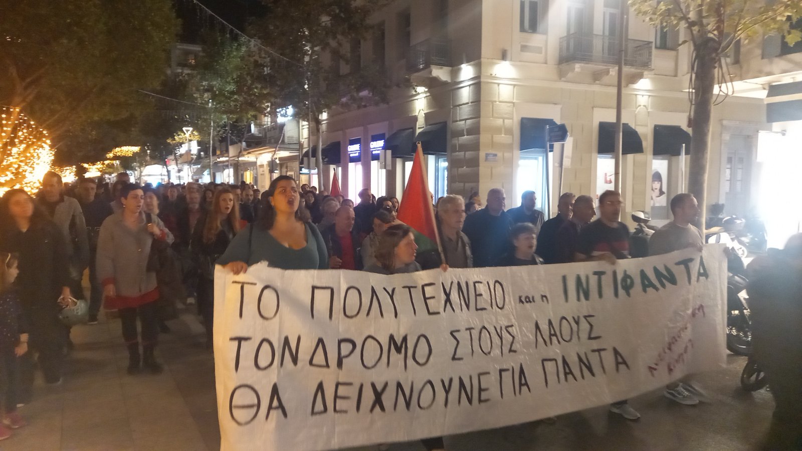 Φοιτητές, μαθητές, εργαζόμενοι σε δημόσιο και ιδιωτικό τομέα, συνδικάτα, εργατικά σωματεία, συλλογικοί φορείς συγκεντρώθηκαν στην κεντρική πλατεία της πόλης και τίμησαν τον αγώνα των φοιτητών τον Νοέμβρη του 1973 ενάντια στη χούντα των συνταγματαρχών, τονίζοντας πως το μήνυμα του Πολυτεχνείου για “Ψωμί, παιδεία, ελευθερία”, παραμένει σήμερα πιο επίκαιρο από ποτέ.
