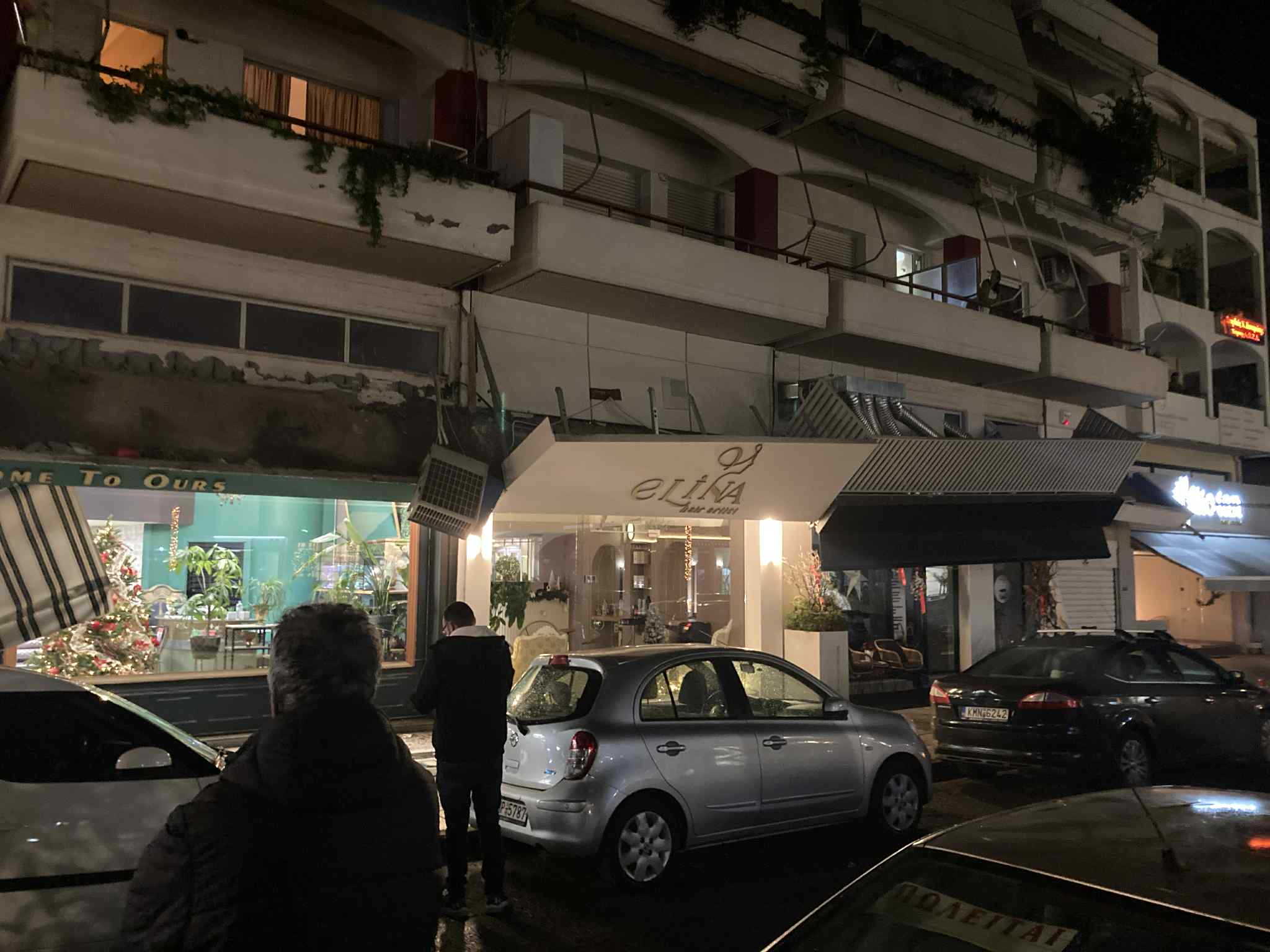 Από την κατάρρευση έπεσαν στο πεζοδρόμιο κομμάτια τσιμέντου, ενώ λίγο έλειψε να πέσει και μία μονάδα κλιματιστικού.