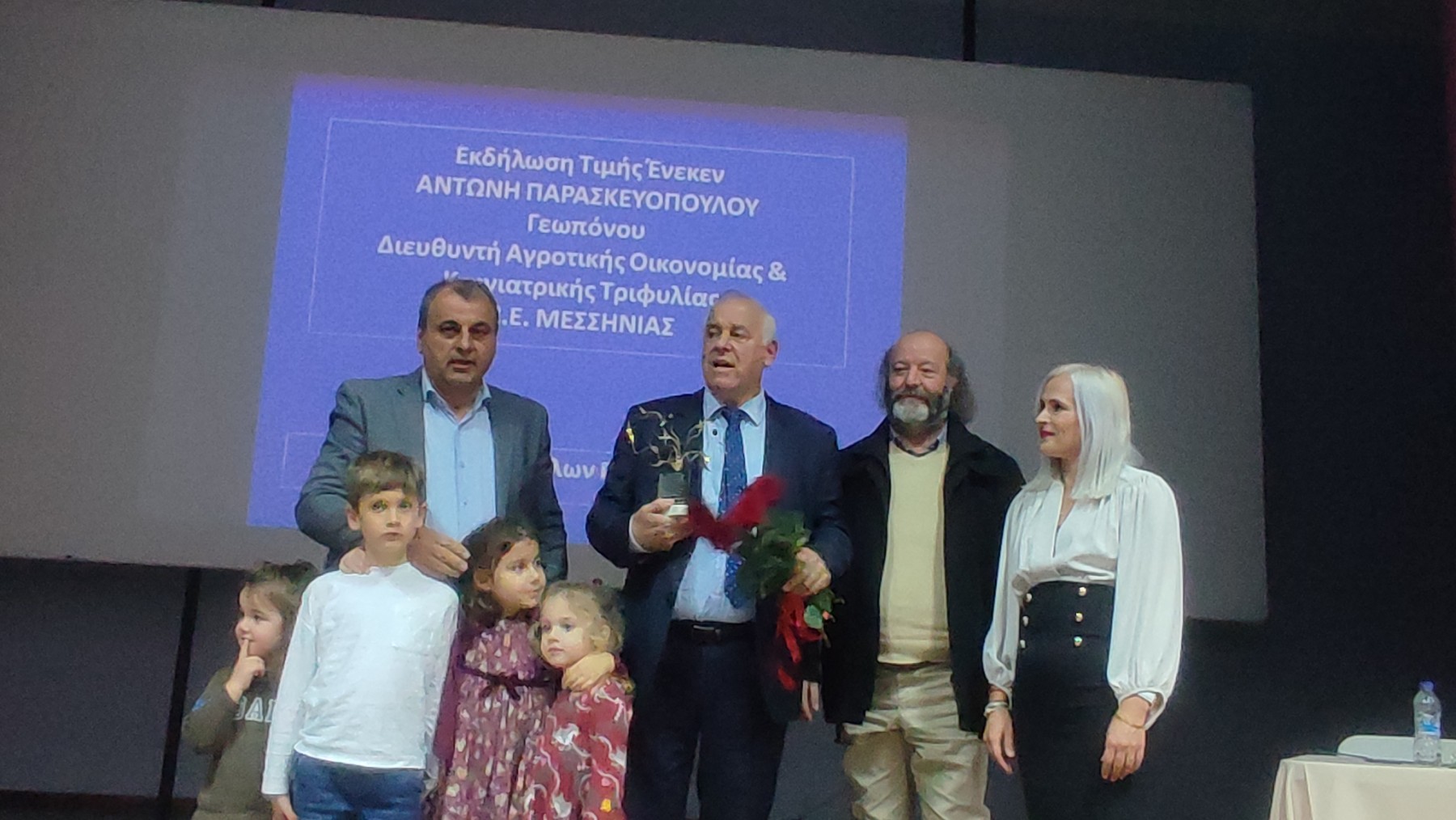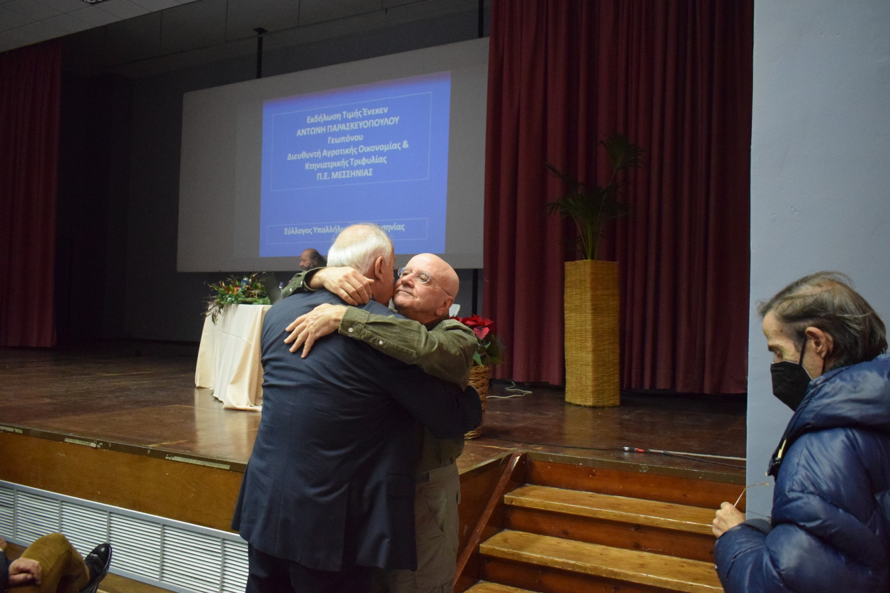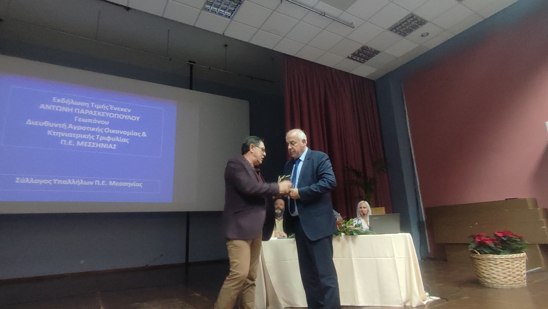 Στην εκδήλωση -που διοργάνωσε για πρώτη φορά ο Σύλλογος Υπαλλήλων ΠΕ Μεσσηνίας για την αποχώρηση κάποιου εργαζομένου- ήταν όλοι εκεί για να τον τιμήσουν, να εκφράσουν τις ευχαριστίες τους στην τεράστια προσφορά του, να μιλήσουν για το πάθος και το όραμά του για τον τόπο και την επιστήμη του και να τονίσουν την εργατικότητα, το ήθος και τη δικαιοσύνη του, για όλα αυτά που τον έκαναν ένα ξεχωριστό κομμάτι για την περιοχή και όχι μόνο.