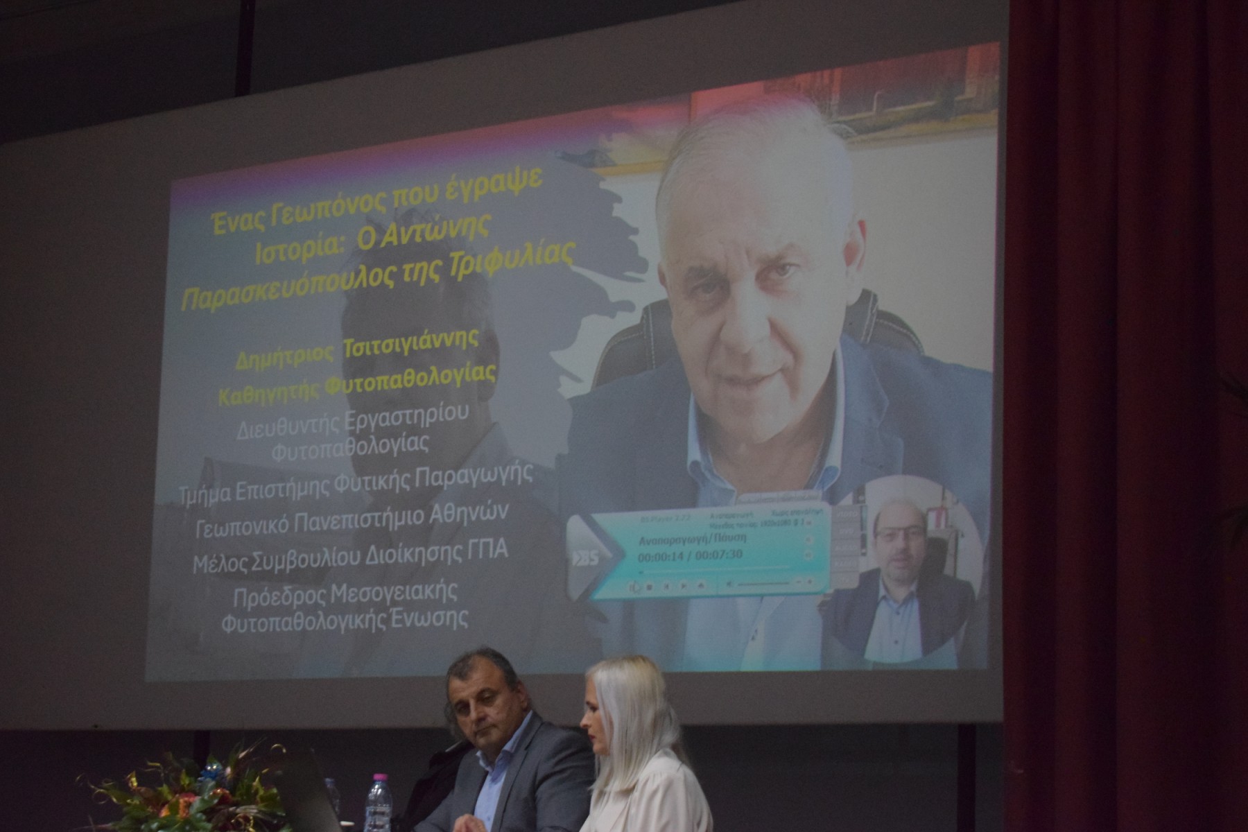 Ακολούθησαν βίντεο με μηνύματα από πανεπιστημιακούς που δεν μπόρεσαν να παραβρεθούν: Τον ΕλευθέριοΤζάμο ομότιμο καθηγητή Φυτοπαθολογίας ΓΠΑ, τον Σπύρο Φουντά καθηγητή Γεωργικής Μηχανολογίας ΓΠΑ, τον Νικόλαο Κατή ομότιμο καθηγητή Φυτοπαθολογίας-Ιολογίας στο Αριστοτέλειο Πανεπιστήμιο, τον κ. Περδίκη καθηγητή Εντομολογίας ΓΠΑ, τον κ. Κίττα ομότιμο καθηγητή του Αριστοτελείου Πανεπιστημίου και τον Δημήτριο Τσιτσιγιάννη καθηγητή Φυτοπαθολογίας ΓΠΑ.