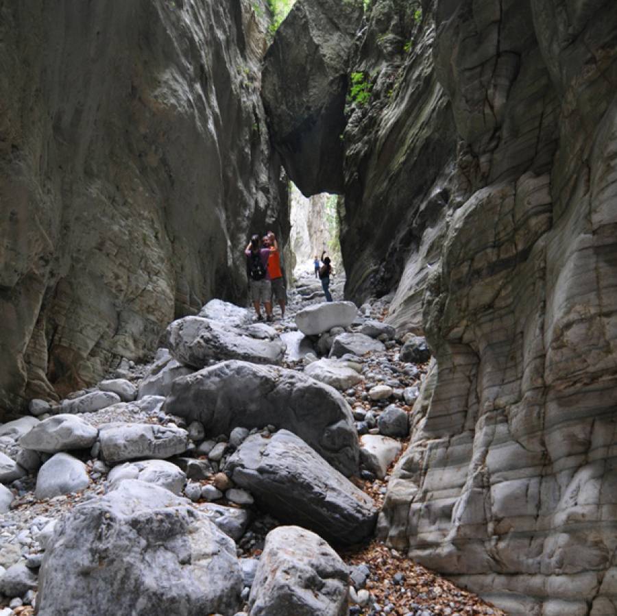 Το μονοπάτι από τον οικισμό των Πηγαδιών προς το φαράγγι του Ριντόμου έχει αφεθεί στη φθορά του χρόνου και η πρόσβαση στο μοναδικό αυτό σημείο παρουσιάζει αρκετά προβλήματα. Πρόκειται για το μονοπάτι που συνδέει τα Πηγάδια με τις Γαϊτσές και παλιότερα το μοναδικό δρόμο επικοινωνίας των περιοχών αυτών. Στο μεγαλύτερό της τμήμα η διαδρομή αυτή αποτελείται από καλντερίμι και κινείται σε φαράγγι κάθετο στο Ρίντομο για να καταλήξει στο τέλος σε αυτό. Παλιά πέτρινα γεφύρια συμπληρώνουν το εντυπωσιακό σκηνικό και αποτελούν ένα ακόμη στοιχείο από τα πολλά που κατατάσσουν το συγκεκριμένο μονοπάτι στα πιο σημαντικά του νομού.