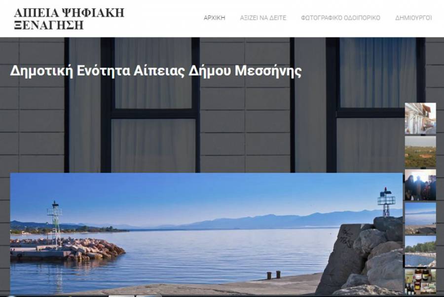 Ψηφιακή ξενάγηση μέσα από την ιστοσελίδα www.aipeia.weebly.com μπορούν να έχουν όσοι ενδιαφέρονται να γνωρίσουν την Δημοτική Ενότητα Αίπειας του Δήμου Μεσσήνης.