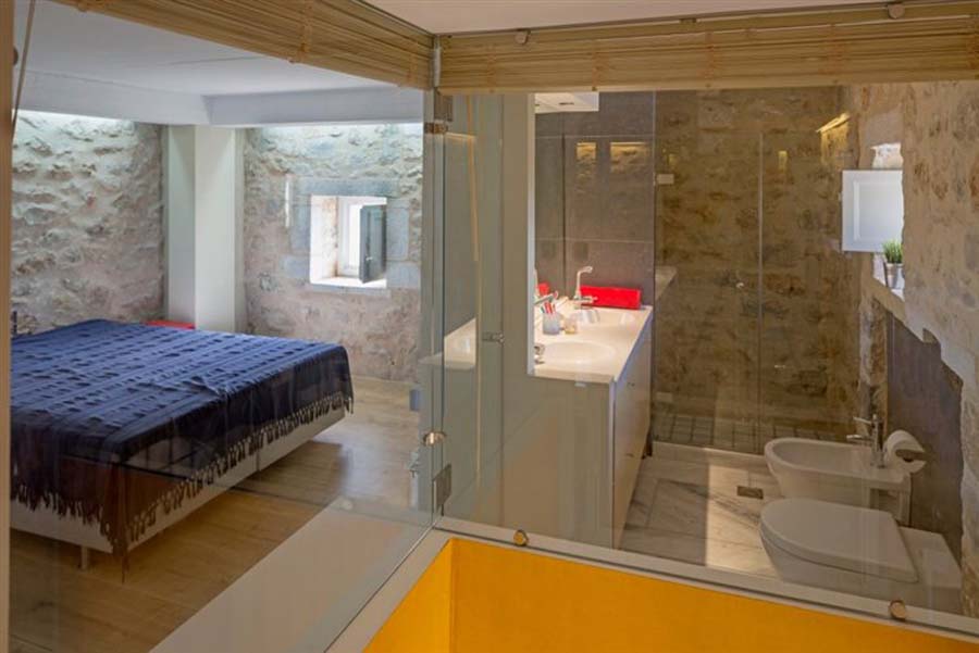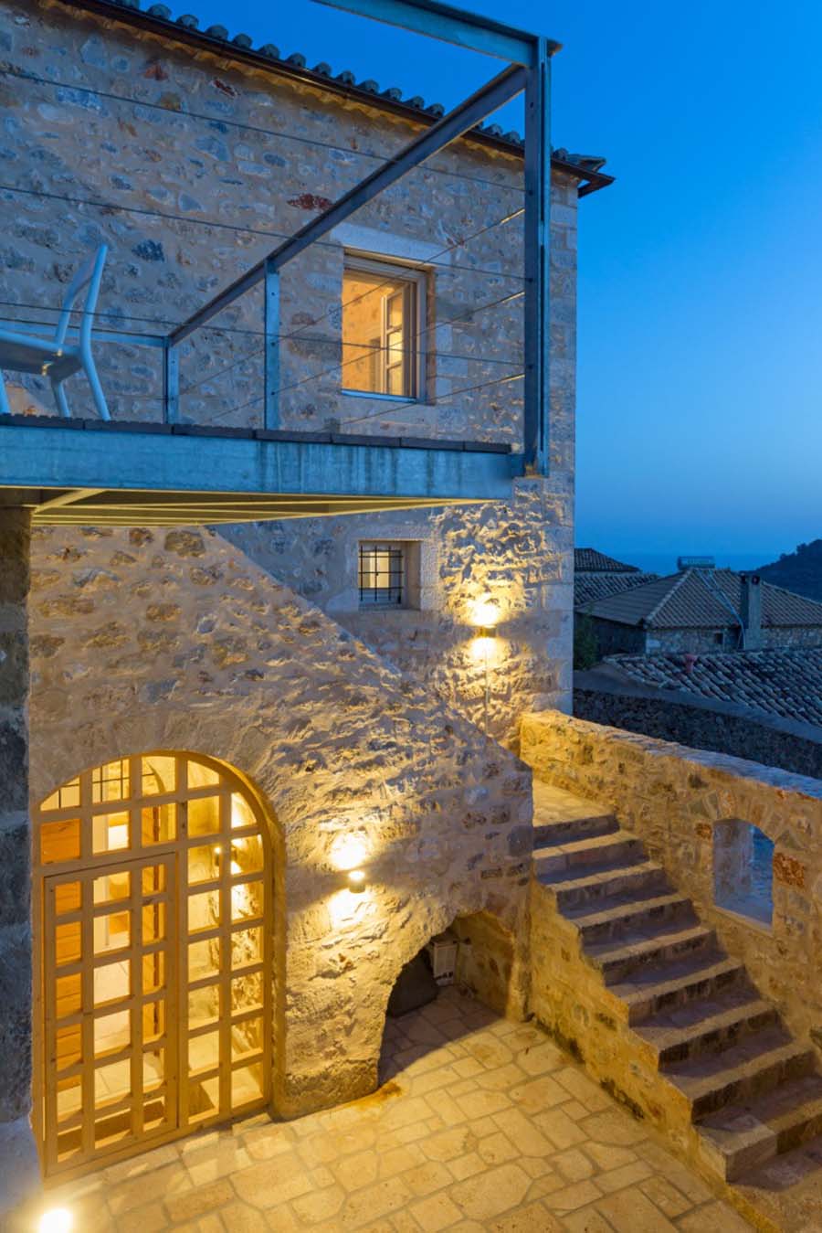 Η ανάλαφρη μεταλλική κατασκευή σε διάλογο με τους ογκώδης πέτρινους τοίχους, επιτρέπει την οπτική επαφή μεταξύ των επιπέδων της κατοικίας και κάνει διακριτές τις επεμβάσεις.