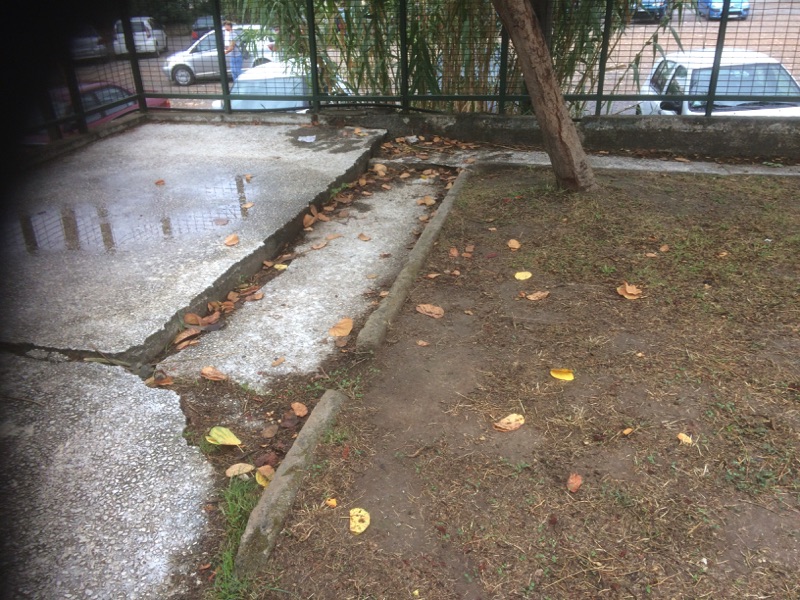 Περιβάλλων χώρος: Ο εξωτερικός χώρος του σχολείου περιμετρικά του κτηρίου μετράει πολυάριθμα σημεία κινδύνου ακόμη και για ενήλικες, πόσο μάλλον για μικρά παιδιά. Ολη η νότια αυλή, κύριος χώρος γυμναστικής και εκτόνωσης, διαστρωμένος με μωσαϊκό της δεκαετίας ‘70, έχει σημαντική καθίζηση και εμφανίζει ανησυχητικές ρηγματώσεις.