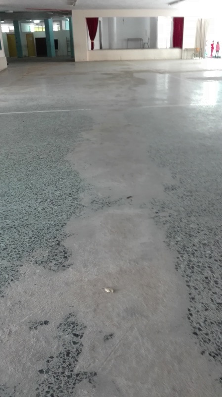 Δάπεδο εσωτερικού χώρου: Το δάπεδο εσωτερικά είναι μωσαϊκό της αρχικής κατασκευαστικής φάσης με προφανείς φθορές σε μεγάλο μήκος του. Τα μεγάλα ρήγματα και απομάκρυνση του συνδετικού κονιάματος δημιούργησαν σημεία επικίνδυνα για τα παιδιά, με αποτέλεσμα την κινητοποίηση των γονέων προ διετίας. Η επέμβαση που έγινε αποτελεί τραγική επέμβαση από κατασκευαστική άποψη και εξελίσσεται σε άκρως επικίνδυνη για την υγεία των χρηστών. Η τσιμεντοκονία τρίβεται και δημιουργεί μια αιθαλομίχλη με μικροσωματίδια που τα παιδιά αναπνέουν σε μόνιμη βάση.