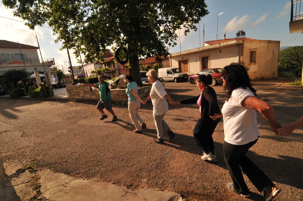 Μετά από αρκετή ώρα σε αυτό το μαγικό μέρος συνεχίσαμε την πορεία μας για να συναντήσουμε σύντομα τον ποταμό Ερύμανθο και τον μικρό οικισμό της Ελαίας όπου κάναμε μια μικρή ανάπαυλα για να φάμε κάτι ή για καφέ. Ακολούθησε μια μικρή βόλτα στον Ερύμανθο. Ενας ακόμη πολύ εντυπωσιακός καταρράκτης στα ανατολικά του ποταμού ήταν το πρώτο που κέντρισε το ενδιαφέρον μας. Αμέσως μετά βρεθήκαμε στα βότσαλα της όχθης. Ο Ερύμανθος εδώ έχει αρκετό πλάτος σε σχέση με τα φαράγγια που κινούμαστε πριν. Τα νερά κυλούσαν ήρεμα, η περιοχή κατακλυζόταν από πλατάνια, ενώ στην απέναντι όχθη ένας ακόμη καταρράκτης έπεφτε από ψηλά. Τα παγωμένα νερά, δεν απέτρεψαν αρκετούς από το να κολυμπήσουν σε αυτά. Το σκηνικό εδώ απέπνεε μια αίσθηση ηρεμίας και γαλήνης. Σίγουρα χρειαζόμασταν πολύ περισσότερο χρόνο για να βιώσουμε στην πληρότητά τους τα όμορφα αυτά δώρα του ποταμού… Ομως είχε φτάσει η ώρα της επιστροφής και της ανάβασης και πάλι στο σημείο που ξεκινήσαμε: το χωριό της Νεμούτας. Και βέβαια μια καλή ιστορία, όπως στο περίφημο γαλατικό χωριό του Αστερίξ, τελειώνει πάντα με φαγητό και χορό! Το φαγητό γι’ αυτούς που ήθελαν είχε κανονιστεί από πριν, ο χορός προέκυψε αυθόρμητα. Ο χορός ξεκίνησε σε χώρο εσωτερικό που όμως δε μας χώραγε… Ο κύκλος του χορού βγήκε έξω για να συνεχίσει προς στιγμήν στην πλατεία του χωριού. Χορός και χωριό έγιναν για λίγο ένα…