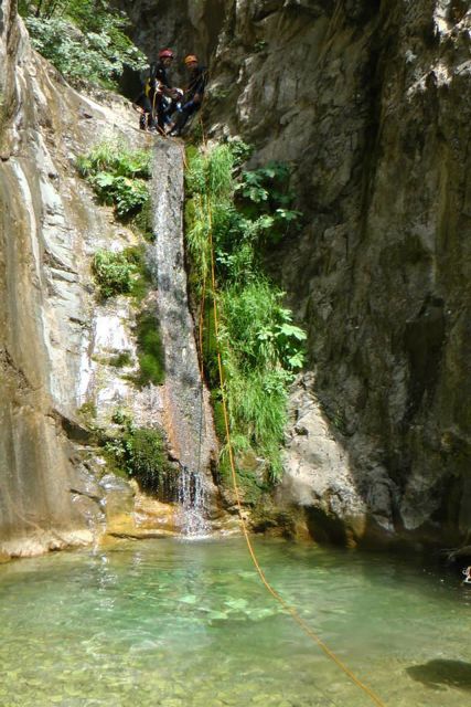 Στη βάση του επόμενου καταρράκτη υπάρχει νερό και μάλιστα αρκετά δροσερό. Αποκαθιστάμε την θερμοκρασία μας και επιτέλους μπορούμε να απολαύσουμε τη μαγεία του φαραγγιού…. Όμως εδώ θα κάνουμε μια παύση. Χρειαζόμαστε πάρα πολλές λέξεις και ακόμη περισσότερο χρόνο για να περιγράψουμε το μυστικό αυτό πέρασμα στη πιο κρυμμένη αγκαλιά του Ταϋγέτου. Και πάλι νομίζουμε ότι ελάχιστα θα μπορέσουμε να αποδώσουμε αυτό που ζήσαμε. Είναι στιγμές που δύσκολα μπορούν να αποτυπωθούν σε εικόνες και λέξεις και σίγουρα σε υποδεέστερο βαθμό από αυτόν με τον οποίον έχουν αποτυπωθεί εντός μας…