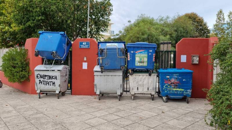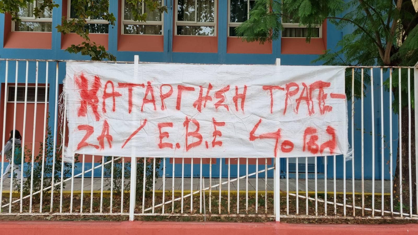 Η κεντρική είσοδος του σχολείου είναι αποκλεισμένη με κάδους, ενώ ένα πανό που έχουν αναρτήσει οι διαμαρτυρόμενοι μαθητές ενημερώνει ότι βασικά αιτήματά τους είναι η κατάργηση της Τράπεζας Θεμάτων και της Ελάχιστης Βάσης Εισαγωγής.