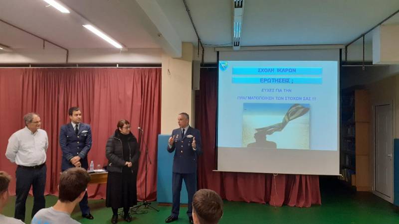 Ο Σμήναρχος τους τόνισε ότι πρέπει να βάζουν στόχους, να προσπαθούν και να επιμένουν μέχρι να τους επιτύχουν. Τους επιβεβαίωσε και αυτός από τη δική του οπτική πως "η Γνώση είναι Δύναμη". Στη συνέχεια, οι μαθητές έκαναν ερωτήσεις ειδικού και γενικού κοινωνικοοικονομικού, στρατηγικού και διπλωματικού ενδιαφέροντος. Η συζήτηση έκλεισε με την παράδοση από τον Διοικητή τιμητικής πλακέτας στο σχολείο και με αναμνηστικές φωτογραφίες.