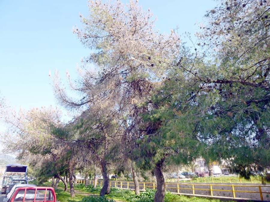 Από το δήμο μας ενημέρωσαν ότι για την εικόνα με τα ξεραμένα -σε μεγάλο τμήμα τους- πεύκα που συναντάται στη νότια, κοντά στη γέφυρα της Λεΐκων, δεν είχαν γνώση. Ομως, μας επιβεβαίωσαν την προσβολή από την κάμπια του πεύκου, που είναι εμφανής με την εικόνα από φωλιές του εντόμου, που μοιάζουν να είναι από βαμβάκι.