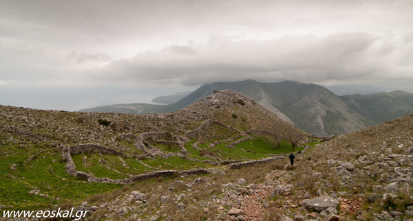 Η ανάβαση συνεχίζεται κοπιαστική, λόγω της απότομης κλίσης και της υψομετρικής διαφοράς, στο κακοτράχαλο μονοπάτι, το οριοθετημένο με πέτρα αιώνων πάνω στο ορεινό ανάγλυφο. Η θάλασσα ξεμακραίνει κάτω χαμηλά και διαγράφεται πανοραμικά κάπου πολύ μακριά στον ορίζοντα, η στεριανή διείσδυση του Κάβο Γκρόσο στο αντάμωμα του απέραντου γαλάζιου, θάλασσας κι ουρανού. Περνάμε ανάμεσα από «λάκκες» (επίπεδες επιφάνειες που κλείνονται γύρω γύρω από βουνά), στις οποίες είναι πρόδηλη ακόμα η ανθρώπινη παρουσία, αφού παρατηρούνται πάμπολλες πέτρινες κατασκευές, οικιστικοί πυρήνες, αναβαθμίδες, πεζούλες κι εντυπωσιακές στέρνες, που έχουν δίπλα τους για το πότισμα των ζώων, περίτεχνα πελεκημένες λίθινες «κορύτες» («σκαφίδια» ή «σκαφιδέλια» όπως ονομάζονται με τη μανιάτικη ντοπιολαλιά). Οπως μας ενημέρωσαν οι ντόπιοι, εδώ ποτίζονται κάθε δυο μέρες κατά τους καλοκαιρινούς μήνες, τα μοσχάρια ελεύθερης βοσκής που ζουν στο οροπέδιο, αποκομμένα από τον κύριο όγκο του Ταϋγέτου.