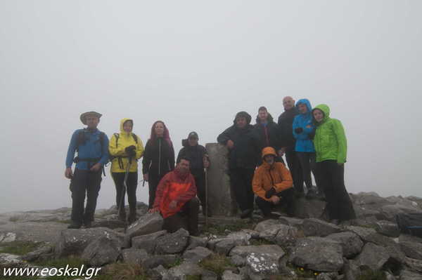 Φτάνουμε πια λίγο πιο κάτω από την κορυφή, αλλά η πυκνή ομίχλη μας εμποδίζει να την προσεγγίσουμε. Η τεχνολογία κι η ικανότητα του αρχηγού της αποστολής, όμως, βοηθά να πατήσουμε το πόδι μας πάνω της. Αναμενόμενη η απογοήτευση... Η ορατότητα δεν ξεπερνά τα 10 μέτρα κι έτσι δεν μπορούμε να θαυμάσουμε την υπέροχη θέα που προσφέρει αυτός ο τεράστιος βραχώδης εξώστης, προς τον Μεσσηνιακό και Λακωνικό Κόλπο, το Κάβο Γκρόσο, τη Χερσόνησο του Τηγανιού, τον Κότρωνα, τη Σκάλα, την Προσηλιακή και Μέσα Μάνη και πέρα βαθιά τη Νεάπολη. Κάπου πιο πέρα, σε απόσταση γύρω στα 150 μ., βρίσκεται χαμένο στην ομίχλη το εκκλησάκι του προφήτη Ηλία. Η παραμονή μας εδώ γίνεται πολύ δύσκολη. Η πυκνή ομίχλη μας μουσκεύει τα ρούχα και μας περονιάζει τα κόκαλα. Ο δυνατός αέρας χειροτερεύει την κατάσταση, κι έτσι ύστερα από τις αναμνηστικές φωτογραφίες ξεκινάμε την κατάβαση, η οποία αποδεικνύεται πιο δύσκολη λόγω της απότομης κλίσης αλλά και της ξαφνικής βροχής που κάνει τις κοφτερές πέτρες να γλιστρούν επικίνδυνα. Συχνές οι πτώσεις που προκαλούνται, ευτυχώς όμως χωρίς τραυματισμούς…