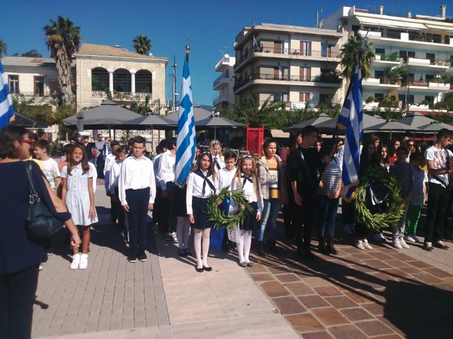 Συγκεκριμένα στις 11, έγινε κατάθεση στεφανιών από μαθητές στην κεντρική πλατεία, στους ανδριάντες των Ηρώων και στην Παραλία, στο μνημείο του Αφανούς Ναύτη.