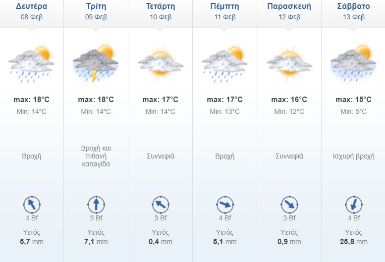 Ακόμη, θα πνέουν θυελλώδεις νότιοι νοτιοανατολικοί άνεμοι κατά μήκος του Ανατολικού Αιγαίου και, κυρίως μετά το μεσημέρι της Δευτέρας, στην περιοχή αυτή προβλέπονται ισχυρές βροχές και καταιγίδες, που κατά τόπους ενδέχεται να συνοδεύονται από χαλαζοπτώσεις. Παροδικές βροχές και σποραδικές καταιγίδες θα υπάρξουν σε αρκετές άλλες περιοχές της υπόλοιπης χώρας.