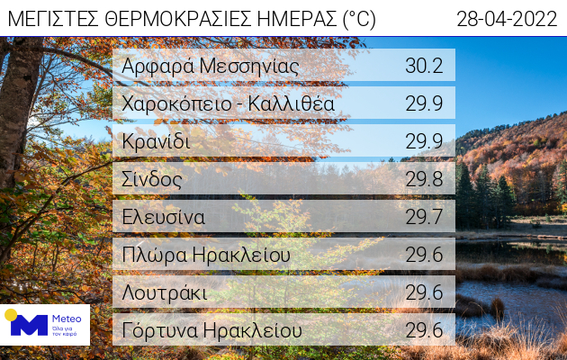 Η υψηλότερη μέγιστη σημειώθηκε στα Αρφαρά Μεσσηνίας και ήταν ίση με 30.2 βαθμούς Κελσίου. Στον σχετικό πίνακα παρουσιάζονται οι 8 σταθμοί που κατέγραψαν τις υψηλότερες θερμοκρασίες το μεσημέρι της Πέμπτης 28/04.