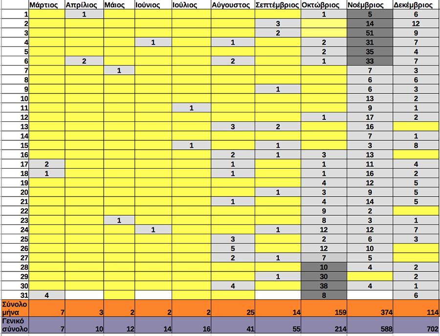 Αναλυτικά τα κρούσματα στη Μεσσηνία ανά ημέρα και μήνα παρουσιάζονται στον πίνακα.