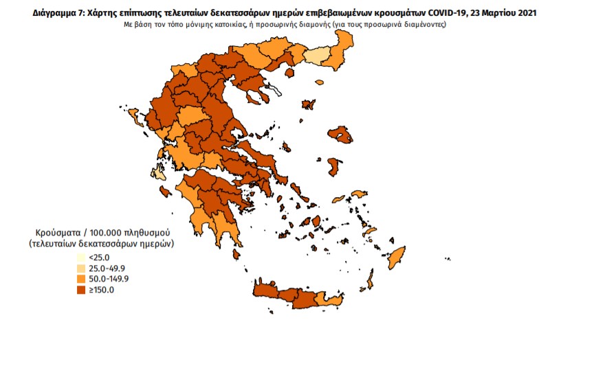 Με βάση τα επιβεβαιωμένα κρούσματα των τελευταίων 7 ημερών, 80 θεωρούνται σχετιζόμενα με ταξίδι από το εξωτερικό και 2.965 είναι σχετιζόμενα με ήδη γνωστό κρούσμα.