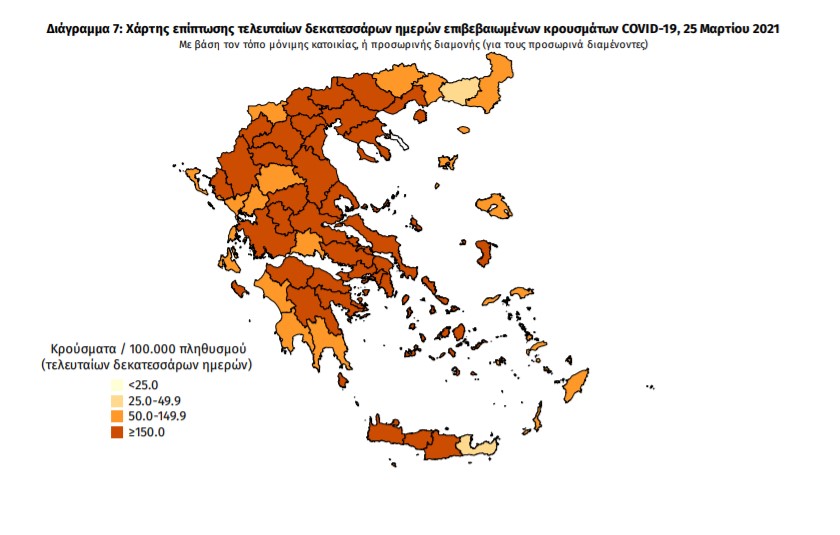 Οι νέοι θάνατοι ασθενών με COVID-19 είναι 52, ενώ από την έναρξη της επιδημίας έχουν καταγραφεί συνολικά 7.701 θάνατοι. Το 95.7% είχε υποκείμενο νόσημα ή/και ηλικία 70 ετών και άνω.