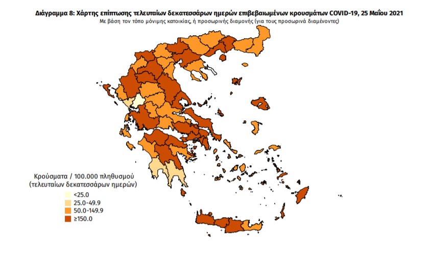 Μαΐου 2021, στο ιικό φορτίο του SARS-CoV-2 στα αστικά λύματα των επτά από τις δώδεκα (7/12) περιοχές που ελέγχονται από το Εθνικό Δίκτυο Επιδημιολογίας Λυμάτων του ΕΟΔΥ.