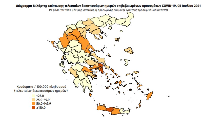 Με βάση τα επιβεβαιωμένα κρούσματα των τελευταίων 7 ημερών, 109 θεωρούνται σχετιζόμενα με ταξίδι από το εξωτερικό και 1.238 είναι σχετιζόμενα με ήδη γνωστό κρούσμα.